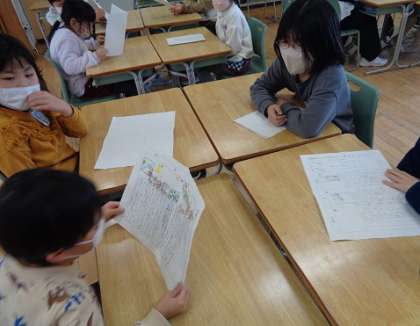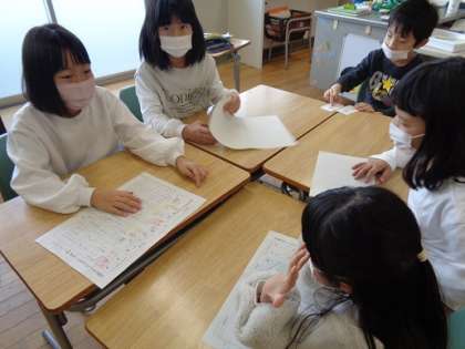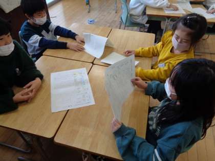 国語科「お話のさくしゃになろう」の学習を生かして、お話を考えました。「はじめ」「中」「おわり」に分けてお話を書き、グループで発表している様子です。