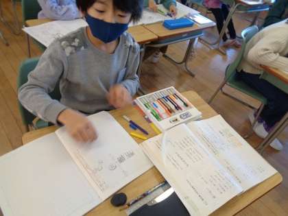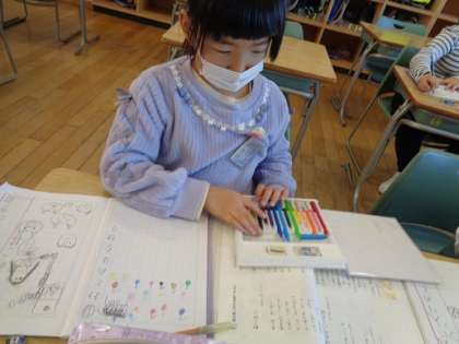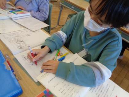 国語科「詩の楽しみ方を見つけよう」の時間では、「ねこのこ」「おとのはなびら」を読んで、想像した様子を絵に描きました。