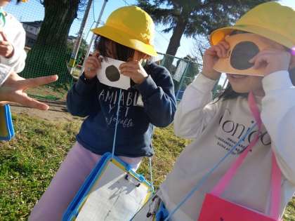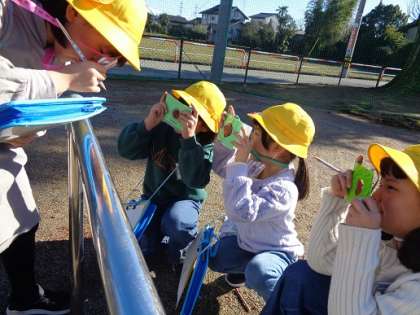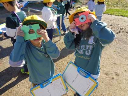 図画工作科「ともだちをみつけよう」では、自分で作ったカメラをもって、グラウンドへ行きました。ブランコの手すりや、プールの壁の模様が顔に見えたようでした。「4つも友達見つけたよ」「学校の中でも友達を探したい」など、子供達は身の回りの顔に見えるものを探していました。