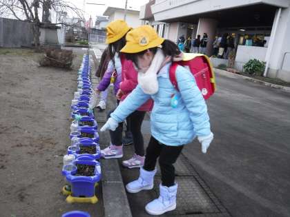 児童玄関では、チューリップの球根を心配している1年生、挨拶活動をする4年生がいました。