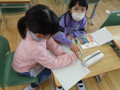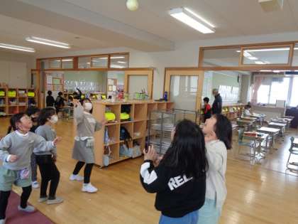 寒いので、教室やワークスペースで過ごす子供たちの様子です。音楽で学習している「小ぎつね」をオルガンで弾いている子供。学級新聞を作っている子供。風船で遊んでいる子供。子供達はそれぞれ、好きなことをしながら休み時間を過ごしています。