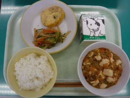 今日は、学校給食「中華ランチ」でした。マーボー豆腐には、豆腐、豚挽肉、干ししいたけ、たけのこ、にんじん、ねぎ、にんにく、しょうが等の食材がたっぷり入り、食感、風味ともによく、おいしくいただきました。
