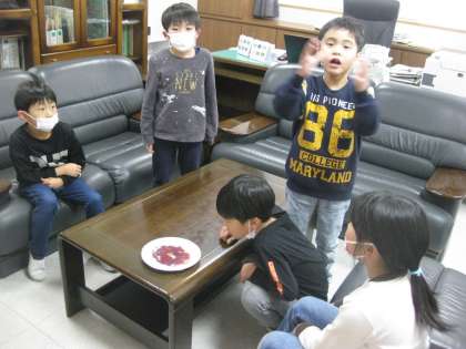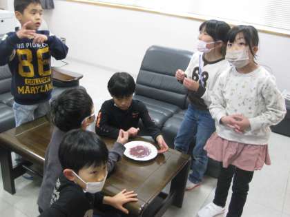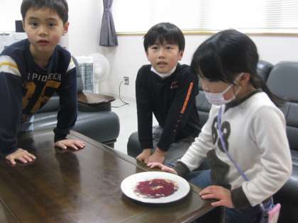 1年生の子供たちが、休み時間に凍った雪があれからどうなったかと観察に来ています。