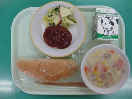 今日の給食 公開日 2023/02/15 更新日 2023/02/15 本日の給食 今日の給食の献立は、 コッペパン 牛乳 コーンチャウダー りんごと白菜のサラダ ハンバーグのケチャップ煮 でした。 今日は、子供たちに大人気のハンバーグでした。甘酸っぱいケチャップがたっぷりまとったハンバーグを子供たちはもりもり食べていました。 明日の給食もお楽しみに。