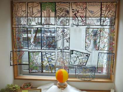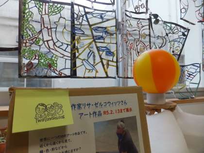 児童玄関前に展示しているリサ・ゼルコヴィッチさんのビーチボールのようなガラスアート作品の背面窓ガラスに5年生のステンシル版画の版が展示されています。このリサさんと5年生のアートコラボ展示は、「どこから見るか」「いつ見るか」「だれと見るか」「どのように見るか」と、楽しみ方がたくさんありました。楽しみ方を知っていると、人生はより豊かになります。その点、老田っ子は人生を実に豊かに楽しめるのではないかと思わずにはいられません。