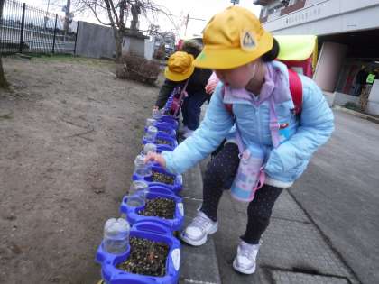 1年生の子供たちが、チューリップの球根を植えた鉢に集まっています。