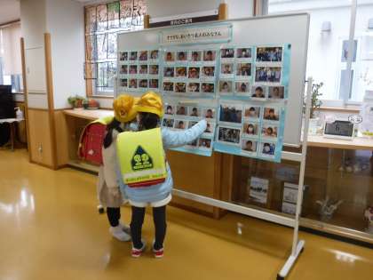 今朝、子供たちが、挨拶名人の写真を見ながら、