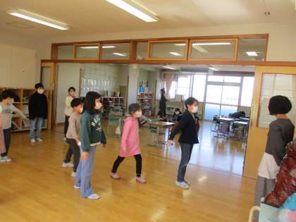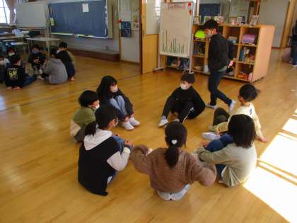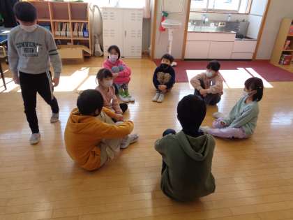午後からは、なかよし班ごとに遊びました。「ハンカチ落とし」や「だるまさんが転んだ」等、なかよし班のみんなで遊べることを楽しみました。