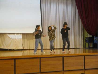 2月28日(火) 4年生 自慢し大会 公開日 2023/03/01 更新日 2023/03/01 4年生 自慢し大会が行われ、4年生からは3人がダンスを披露しました。この3人は、毎回参加しており、回を重ねるごとに動きがそろってきています。全校の前でも楽しんでダンスをしていました。