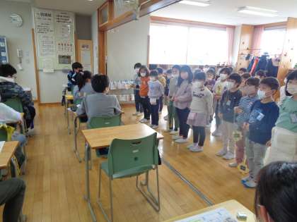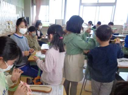 1年生は6年生にメダルのプレゼントをしました。心を込めて折ったメダルにメッセージも添えて、渡しました。