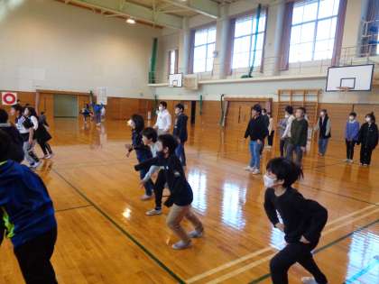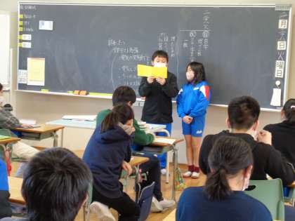 卒業を祝う会でどんなことをしたいかと話合いをしたときに、6年生と一緒にドッジボールをしたいという意見もあったため、休み時間に行いました。6年生に招待状を渡しました。4年生も6年生も力一杯ボールを投げ合って楽しんでいました。