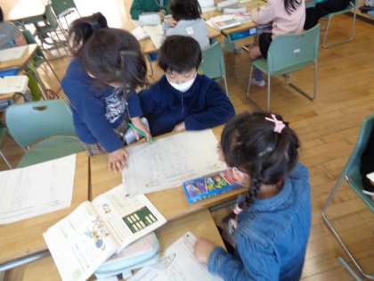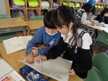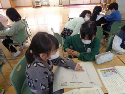 国語科の学習では、1年間を振り返って、楽しかったことを作文に書きました。子供達は、今まで学習した、「初め」「中」「終わり」の構成を考えていました。写真は、子供同士で、書いた文章を見合い、アドバイスをしている様子です。