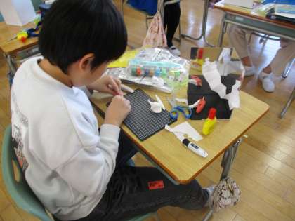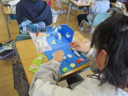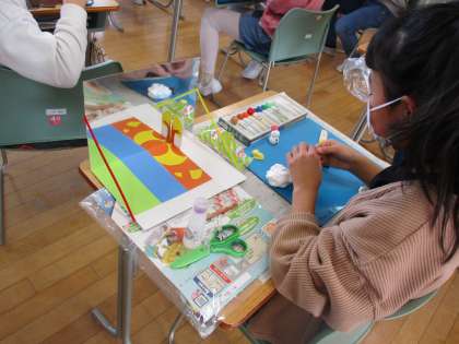 図画工作科では、鏡の仕組みを利用し、奥行きのある作品を製作しています。紙粘土や工作用紙でつくった部品を置く位置を変えるだけで、見え方が変わることに気付くと、工夫して配置を考えていました。完成が楽しみです。