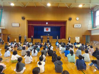 校長先生から、「今年度は老田小学校の創校150周年の節目となる年です。今年度は、節目となる150周年をお祝いするとともに、みんなで力を合わせて、さらによりよい老田小学校をつくっていきましょう。そのためには、昨年度からがんばってきた「進んであいさつをしよう」、「なりたい自分を目指してチャレンジしよう」、「自分の命は自分で守ろう」の3つについて、今年度、自分で目当てをもって取り組みましょう。明日は、1年生のみなさんが入学してきます。お兄さん、お姉さんとして、老田小学校のくらしをつくっていきましょう」と話がありました。子供たちは、真剣に話を聞いていました。