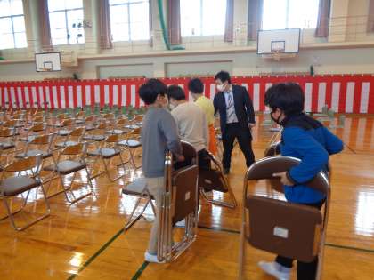 最高学年として1つ目の仕事は、入学式の準備です。体育館や1年教室の環境を整えたり、校舎の清掃を行ったりしました。