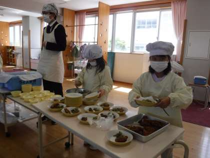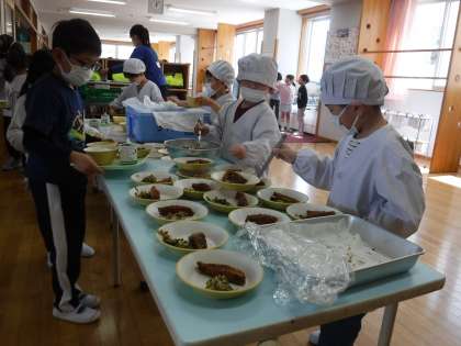 給食の時間が始まりました。1年生の給食当番の子供たちは、てきぱきと配膳を始めました。はんがいやお玉、トング等、用具がありますが、上手に使って配膳をしています。