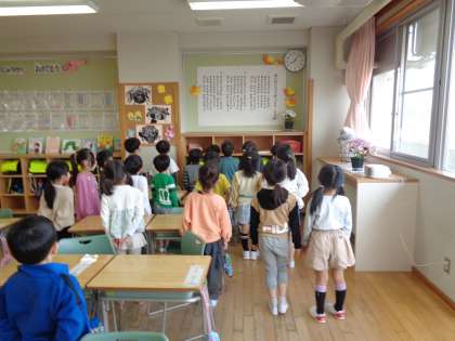 校歌の練習をしています。少しずつ歌詞を覚えてきたようです。