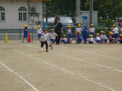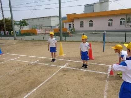 今日は1,2年生合同で50m走をしました。1年生はゴールのコーンを目指してまっすぐ走ることができていました。2年生は1年生に負けないように全力で走っていました。運動会が楽しみです。