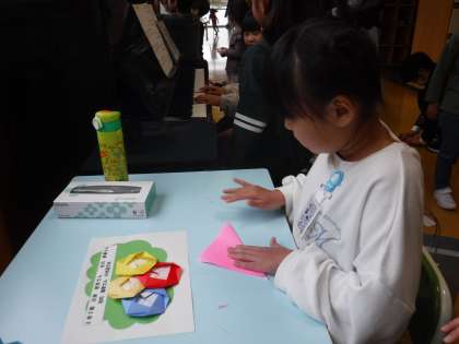 「1回目に折ったときより、上手に折れたよ」と、折り紙で薔薇を折るのを見せてくれた4年生。
