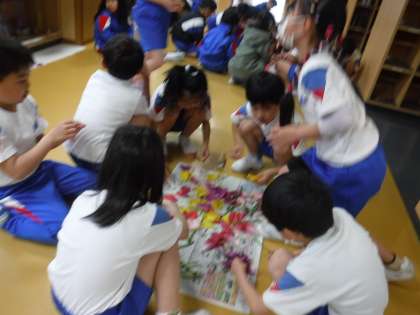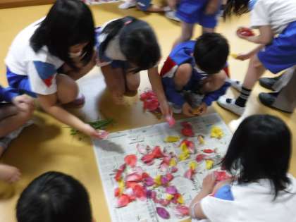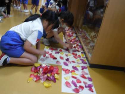 「色水を作ってみんなに見てもらいたいな」「押し花にしたいな」「模様を作りたいな」など、いろいろな生かし方を考えていましたが、「1階のハムスターハウスの隣に、フラワーロードを作ろう」と決定して、色団ごとに花びらを並べて美しいロードを作りました。