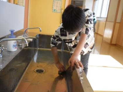 子供たちは、ゼッケンを着けた6年生を中心に掃除をしています。