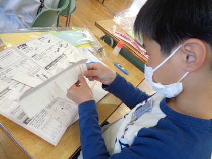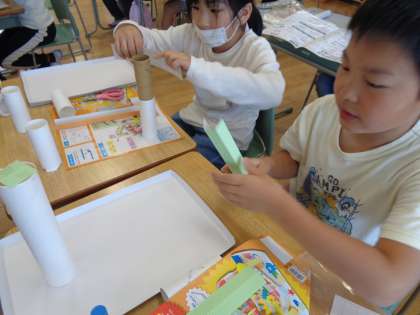 図画工作科「コロコロガーレ」では、高さを活かしてビー玉を転がすコースを考え、画用紙や紙筒でオリジナルコースづくりを始めました。