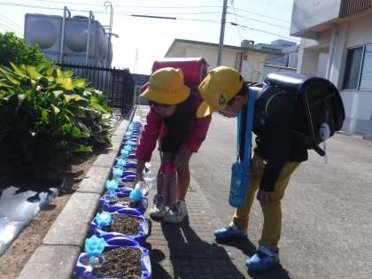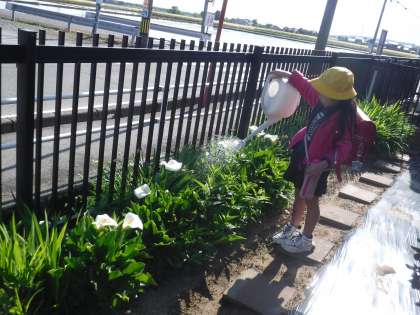 5月12日(金)やさしい心が伝わります 公開日 2023/05/12 更新日 2023/05/12 メール用カテゴリ 登校した1,2年生の子供たちは、野菜や鉢植えに水を遣りにいきます。 毎日、自分の鉢の様子を見に行っています。 自分のに水を遣ってから友達のにも水をやるやさしい姿が見られました。 花壇の花にも毎日水やりをしてくれてありがとう!