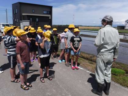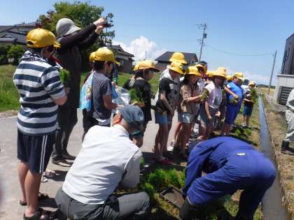 5月15日(月)5年生 社会科・総合「田植え体験」1 公開日 2023/05/15 更新日 2023/05/15 メール用カテゴリ 午前中は雨模様でしたが、午後からは田んぼの水面に青空が映るほどよい天気になりました。 今日は、地域の方々にお世話になり、5年生は田植えを体験しました。 始めに代表の方から田植えの仕方を教わりました。 苗を初めて手に取った子供たちは、「こんなに細いのだね」「稲は黄色っぽくなるけれど、苗は緑で細いね」と感想を述べていました。