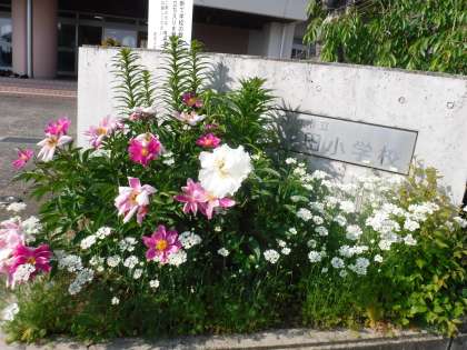 校門の傍の花壇の花が満開です。紅白のシャクヤク、カラーがいよいよ満開となりました。スプレーバラが一輪咲きました。紫陽花の花芽が少しずつ育っています。