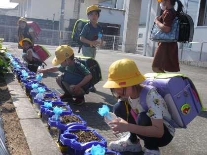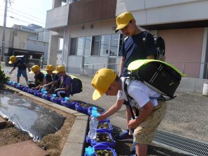 登校した1年生の子供たちが、ペットボトルじょうろで水やりをしています。