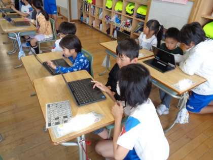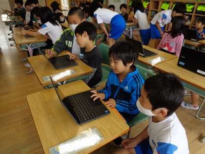 5年生さんが1年教室にきて、クロムブックの使い方を教えてくれました。休み時間や掃除の時間など、いつも優しく助けてくれる5年生さんです。