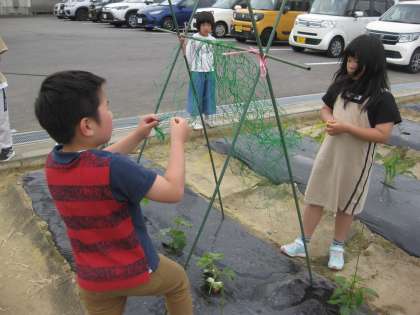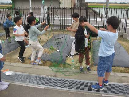 今日の生活科では、畑に行き、きゅうりとメロンにネットをつけました。自分たちでネットがいるかどうか、ネットの付け方等を調べ、試行錯誤しながらなんとかネットを付けることに成功しました。