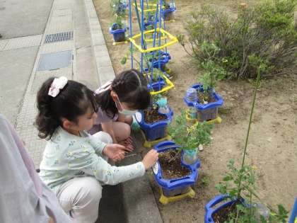 また、トマトの脇芽をとった方がいいと友達から聞いた子供たちが、脇芽を探して取る姿もありました。