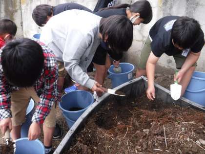 5年生は、バケツで稲作りに挑戦するために、今、土づくりに取り組んでいます。