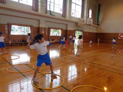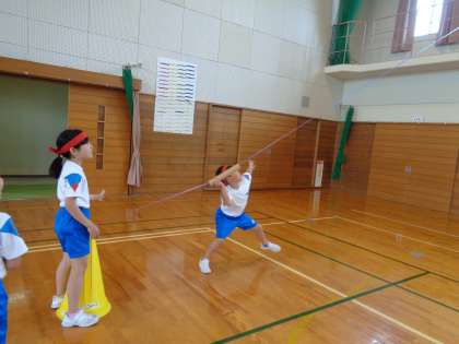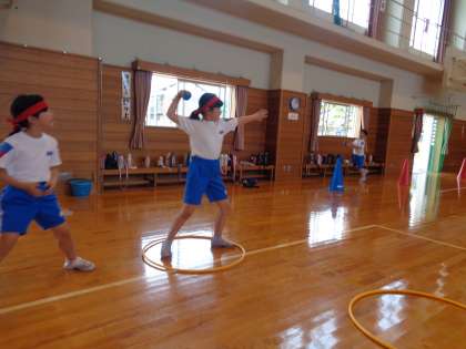 筒やお手玉を用いて体の向きや動きを確認しながら練習すると、遠くまで飛ぶようになってきました。体力テストのソフトボール投げで去年の記録よりもよい記録を出したいと熱心に取り組んでいます。