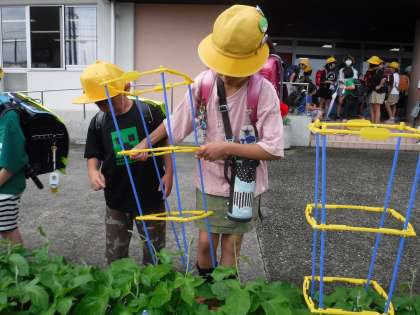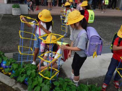 早速、これまでアサガオを育ててきたお兄ちゃん、お姉ちゃんたち、先輩たちが、1年生の支柱立てを手伝っていました。