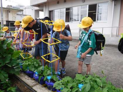 登校した子供たちは、育てている植物に「おはよう」を言って世話をしています。