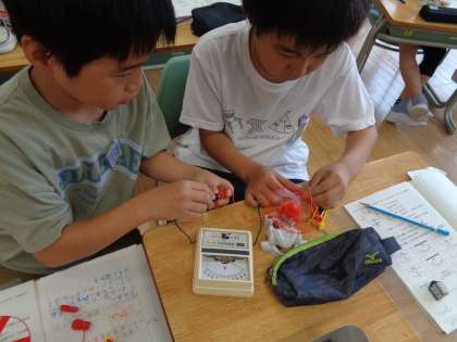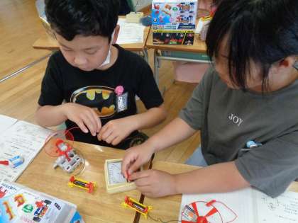 理科では「電気のはたらき」をモーターでプロペラを回しながら学習しています。電池の向きやつなぎ方を変えて、比較しながら実験中です。
