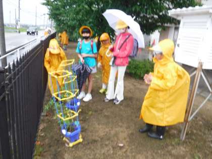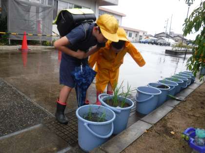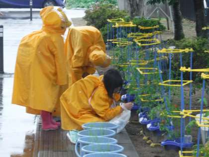 6月22日(木)雨でも変わらず 公開日 2023/06/22 更新日 2023/06/22 メール用カテゴリ 登校した子供たちは、マイ野菜、マイアサガオ、マイ稲に「おはよう」を言って、顔を見にいきます。 「見て見て、ミニトマトが赤くなってきたよ」 「昨日より赤くなったよ」 「私のは、まだ緑だよ。でも数が増えたよ」 と、ミニトマトを囲んで、生長について談義しています。お兄ちゃん、お姉ちゃんも入ってくれました。 子供たちは、雨でも変わらず野菜や植物を大切にしていました。