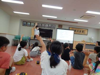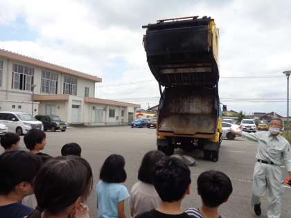 3Rの説明を聞いたり、リサイクル品の実物を見たりしました。クイズも入れて分かりやすく話してくださり、子供たちはこれからも自分にできる3Rの活動をしてゴミを減らそうと思うことができました。また、収集車を間近で観察することができました。大きく収集口が開く様子に「わぁ」と歓声も上がりました。