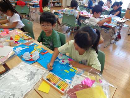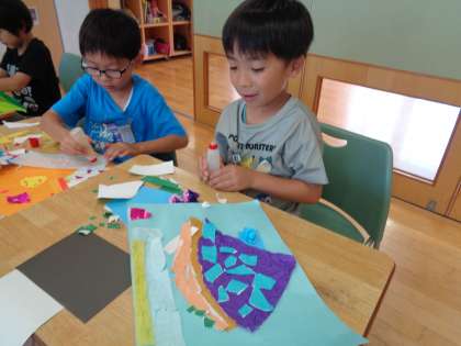 「やぶいたかたちからうまれたよ」の学習では、紙をちぎって、何かに見立てました。友達と話しながら、楽しそうに想像を膨らませていました。