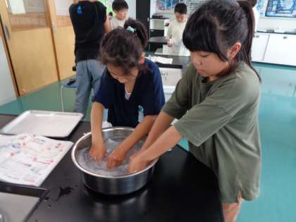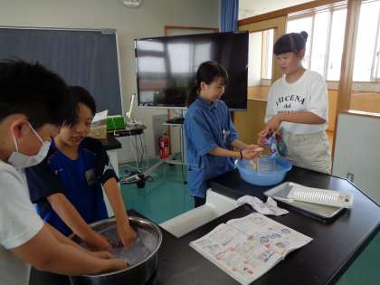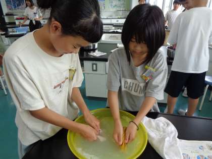 家庭科では、衣服の手入れ方法を学習しています。今日は靴下の手洗いにチャレンジしました。すぎや脱水の工程が大変だったようで、洗濯機の有り難みを改めて感じていました。家族の一員として家庭生活にも生かしていきましょう。