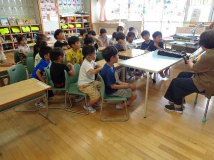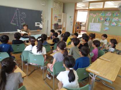 1学期最後の読み聞かせをしていただきました。「夏休み中にもたくさん本を読んでくださいね」と言われ、子供たちは「はい」と元気よく返事していました。