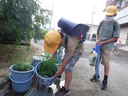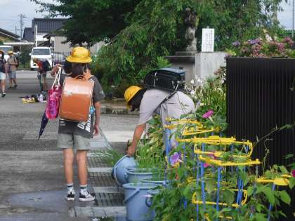 雨でバケツが満水になっていたのを見て、「今は干さなきゃならないんだよ」と、一人が水を減らしたら、次々に友達のバケツの水も開けていった子供たち。