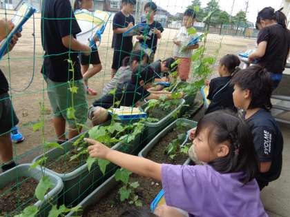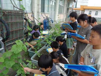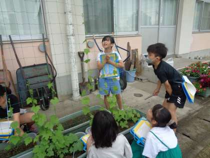 7月14日(金) 4年生 ヘチマの観察 公開日 2023/07/18 更新日 2023/07/18 4年生 ヘチマの観察を行いました。 植え替えたときは手のひらサイズだったヘチマが今は、つるが伸び、子供たちの身長まで伸びていました。