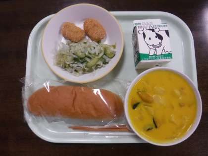 「えごま」の乾燥葉が和えてあるえごまドレッシングサラダは、オリーブ油、酢が入り、風味よく後味がさっぱりしていました。濃厚なかぼちゃポタージュと合うパン食のメニューでした。