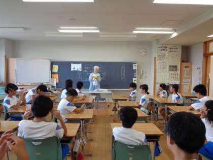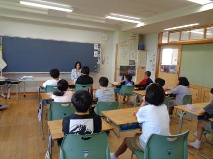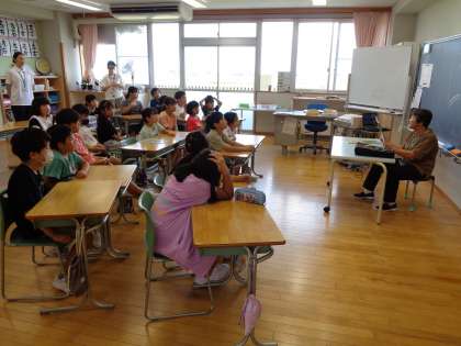 上学年の教室では、それぞれの学年が楽しみながらお話を聞いていました。