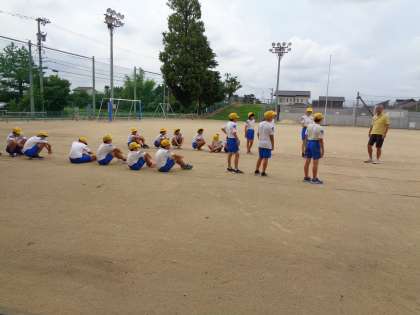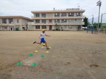 今週の体育では、少しずつ暑さに慣らしていきながら、15日に行われるチャレンジ陸上記録会に向けて練習しています。走り幅跳び、50メートル走、ソフトボール投げの記録更新を目指し、体の動かし方を確かめました。当初の予定より1週間延びたので、練習できる期間が増えたことを喜んでいる子供もいました。