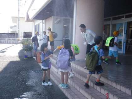 登校した子供たちは、児童玄関のミストに迎えられました。