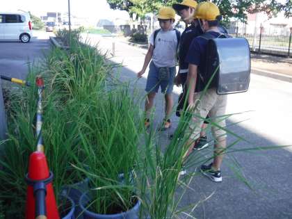 5年生の子供たちは、夏休み中に育てたイネの前で話をしています。